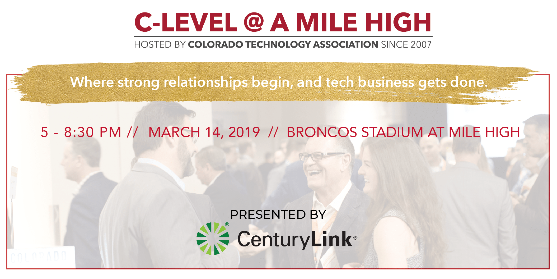 C-Level @ A Mile High is the Colorado Technology Association’s largest fundraiser, packed with a C-level celeb auction, prizes and Tech Exchange to help carry out its mission of fueling Colorado’s economy through technology. It’s the perfect opportunity to build relationships with peers, win business and be introduced to tech companies and influential IT leaders in a setting unlike any other within Colorado.